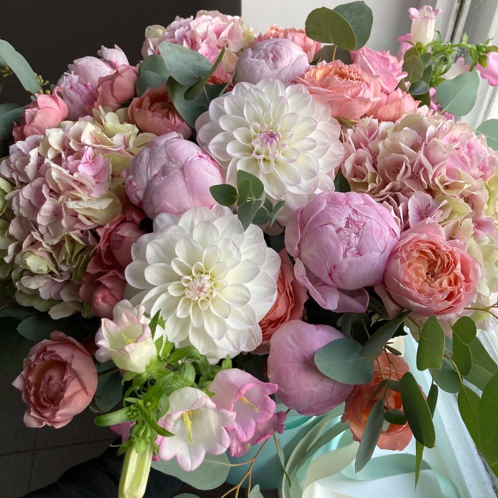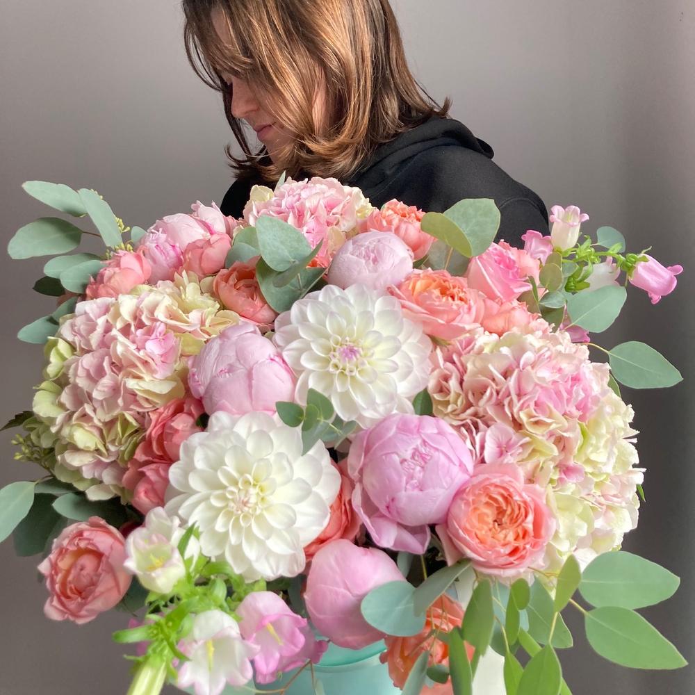 Гортензия – 3 шт.Роза кустовая пионовидная – 7 шт.Роза пионовидная – 5 шт.Колокольчик – 5 шт.Георгина – 3 шт.Эвкалипт – 5 шт.Шляпная коробка – 1 шт.Лента атласная – 2 шт.Тишью – 2 шт.Оазис флористический – 2 шт.