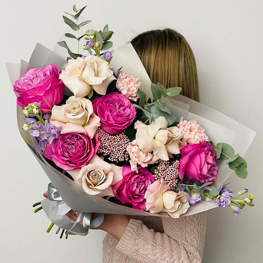 Роза Эквадор – 5 шт.Роза – 6 шт.Озотамнус – 2 шт.Диантус – 3 шт.Маттиола – 3 шт.Эвкалипт – 3 шт.Упаковка дизайнерская – 3 шт.