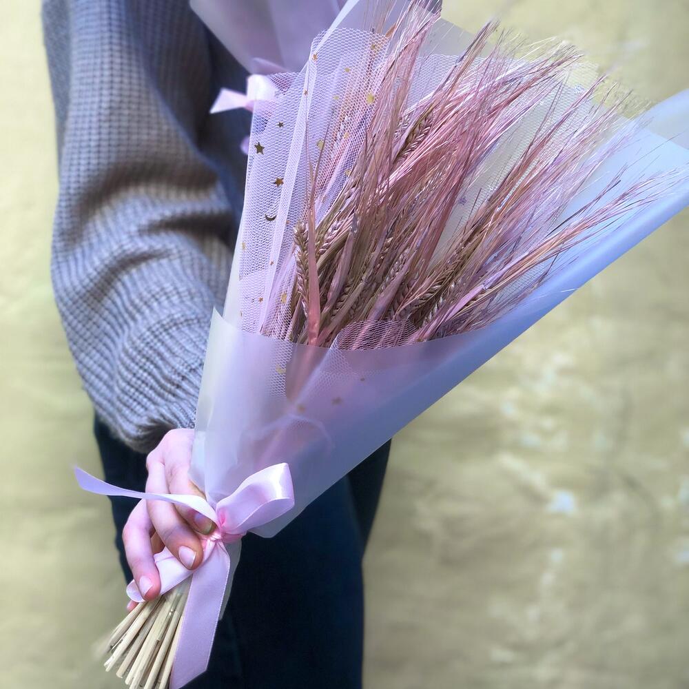 пшеница сухоцвет пучок – 10 шт.Упаковка дизайнерская – 1 шт.Лента атласная – 1 шт.корейская пленка матовая – 1 шт.