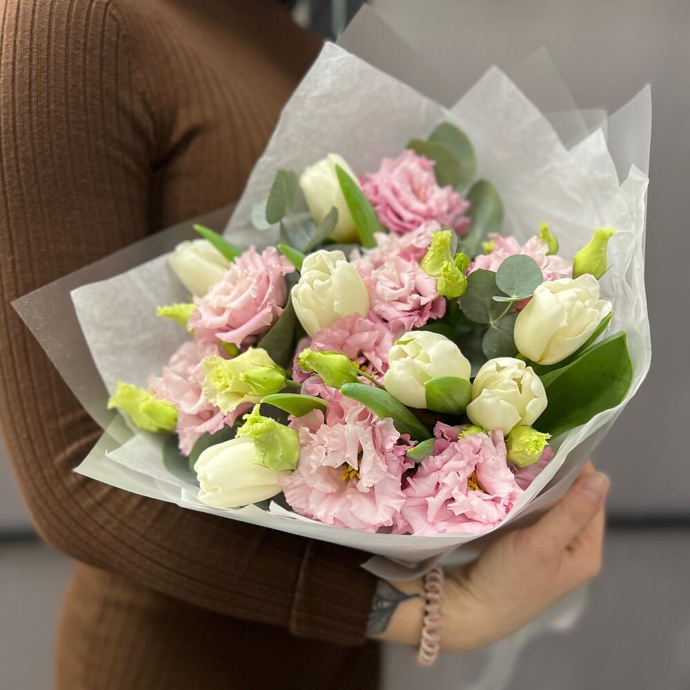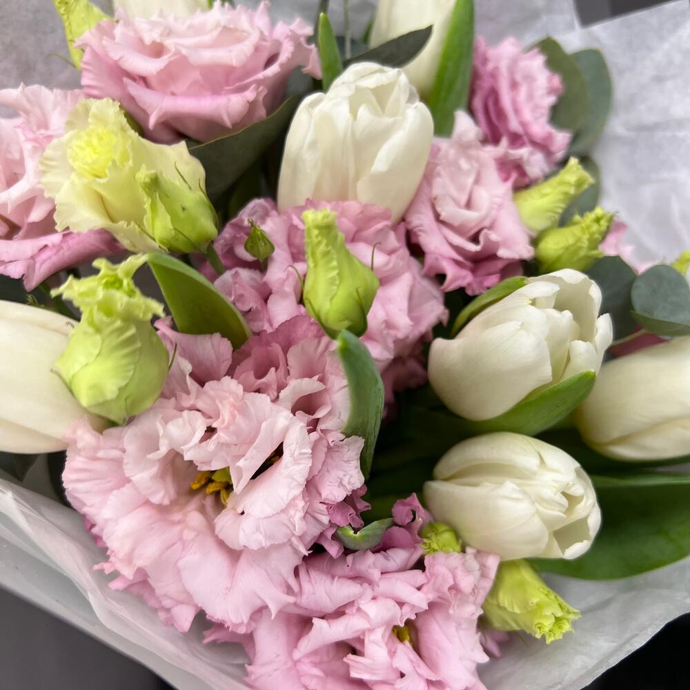 Тюльпан белый – 7 шт.эустома розовая махровая – 3 шт.Эвкалипт – 1 шт.Тишью – 1 шт.Пленка матовая – 2 шт.Лента атласная – 2 шт.