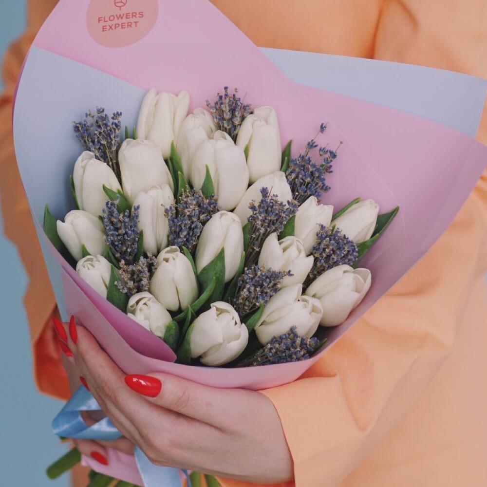Букет с белыми тюльпанами и лавандой