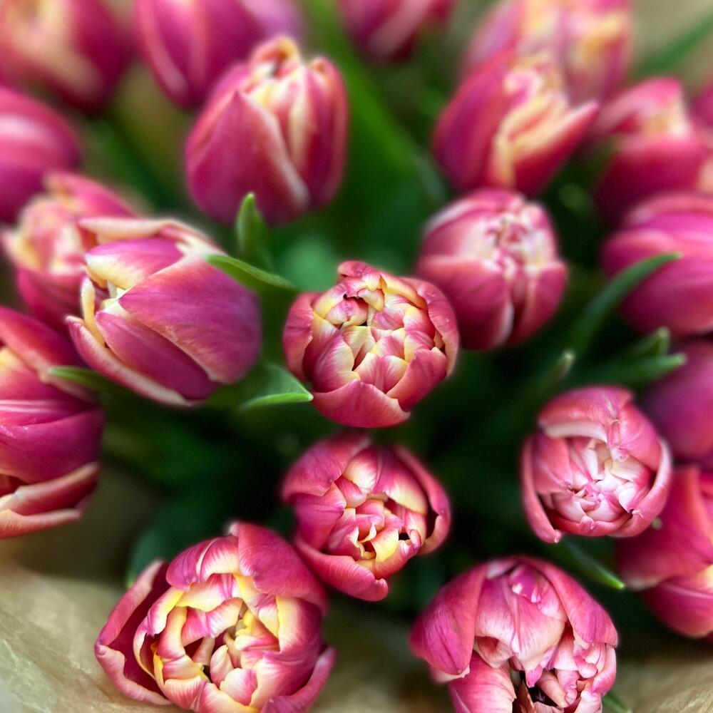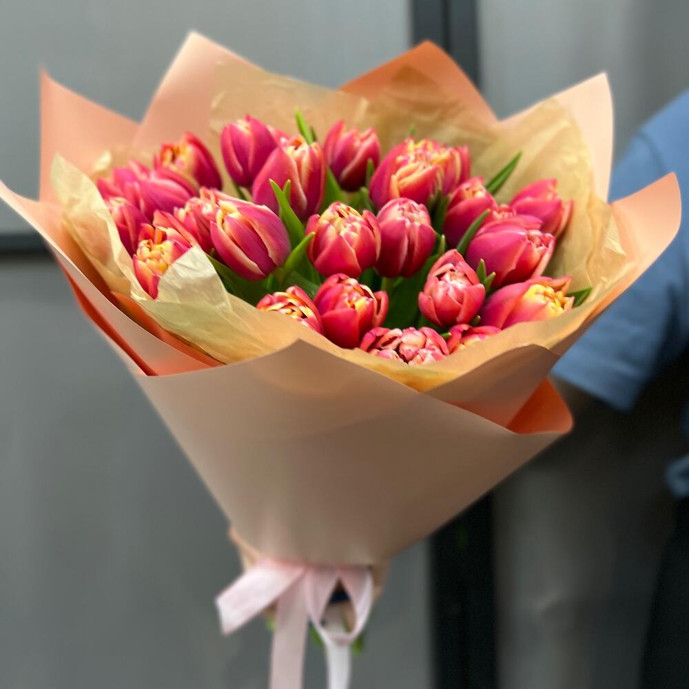Тюльпан пионовидный – 25 шт.Тишью – 2 шт.Пленка матовая – 3 шт.Лента атласная – 2 шт.