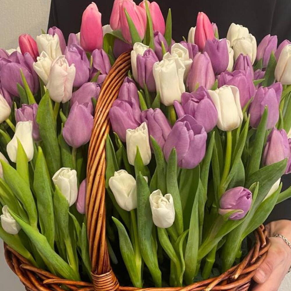 Тюльпан – 101 шт.Корзина плетеная – 1 шт.Оазис флористический – 4 шт.